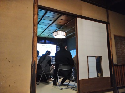 この日は産官学プロジェクトで活動する学生が本番を前にイベント企画の報告を行いました。静かな佇まいに、思わず背筋が伸びた?様子の学生たち。まちやを興味深く見学しましたよ。風情あるお庭、お茶室、畳の香り、オレンジの灯り……いつもの教室とは違う雰囲気の中、自分たちのプロジェクト内容をパワーポイント資料をもとに共有し、改善点などの意見交換をしました。