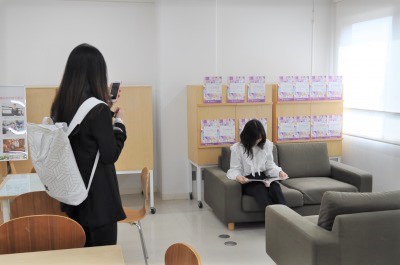学科の特色をオススメするパネルやパンフレット、学生の制作物が展示されました。普段どのような場所でどのようにコモンズを利用しているのかしら……机、ソファ、本棚、カウンターなどで学生が撮影に臨みました。撮影担当者の方にアドバイスをもらいながら、なんとか撮影も無事に終了!!