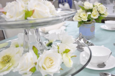 こちらはメインテーブル。ナプキンはシンプルに。食器、カトラリー、お花と白が映えて格式のあるコーディネートになっています。上品にアフタヌーンティーを楽しむゲストが連想されますね。