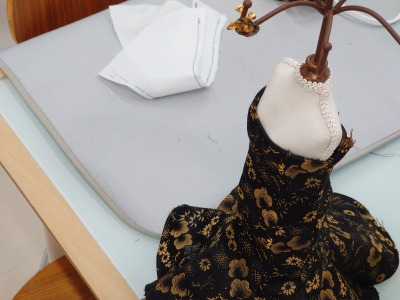 落ち着いた色合いの、ラインが素敵なドレスですね。