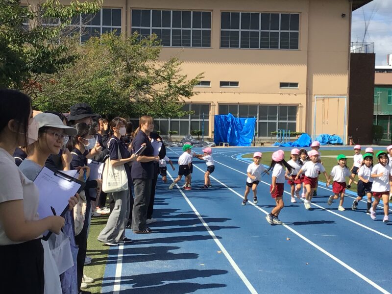 先日、「保育内容(健康)」の授業を受講している1年生は、五条通を挟んですぐの南校地で行われている光華幼稚園の運動会練習を参観しました。