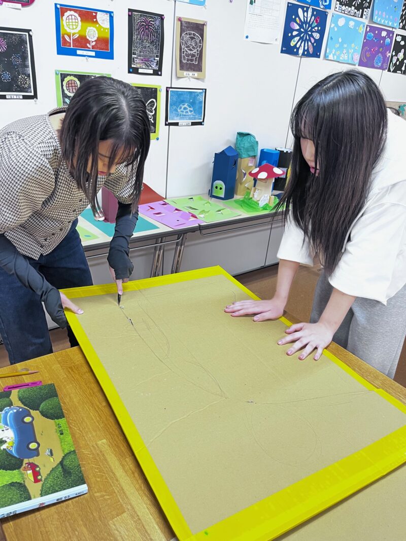 3年生が図工室いっぱいに絵本の世界を作り出そうと頑張っています。