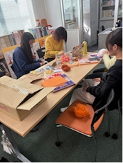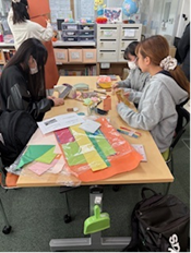 様々な色画用紙や折り紙やハサミなどを使って子どもたちが笑顔いっぱい楽しめる空間を作れるためにみんな頑張っています!