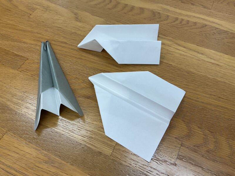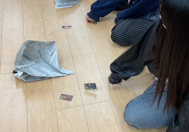 体験授業では、投球動作を経験できるめんこ、新聞鉄砲、紙飛行機を作って遊びました。