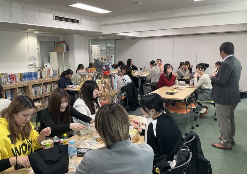 こども教育学科の1年生が、コモンズに集まってクラスミーティングを行いました。