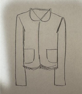 裾と襟にフリルをつけたジャケットを作りたいと考え、シンプルな中にも可愛らしさを感じられるデザインを目指しました。過去のジャケットデザインや平成15〜25年頃の流行を参考に、現代のトレンドと融合させたデザインを検討しました。派手すぎず、日常の中でも着やすい印象にするため、全体の形はすっきりとまとめています。