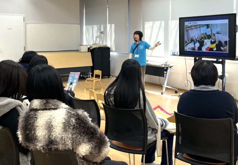 体験授業では、わらべうた遊びをしました。「あがりめさがりめ」や「だるまさん」「なべなべそこぬけ」「おべんとうばこのうた」などたくさんのわらべうた遊びを友達や親子で楽しむ様子がありました。実際に自分の顔を触ったり、お互いの顔を見合ったりして遊ぶ楽しさを感じることができました。
