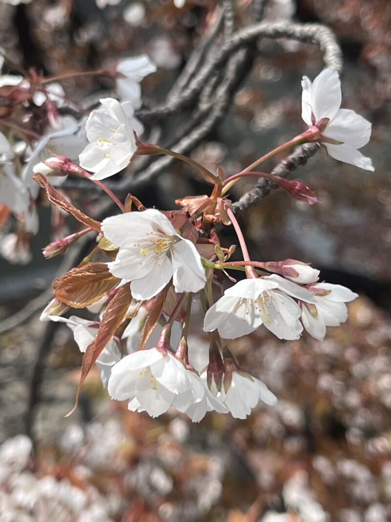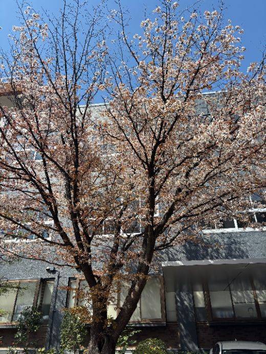号館前の山桜が満開です。山桜の特徴は花と同時に赤茶色の若葉が開くことが特徴です。