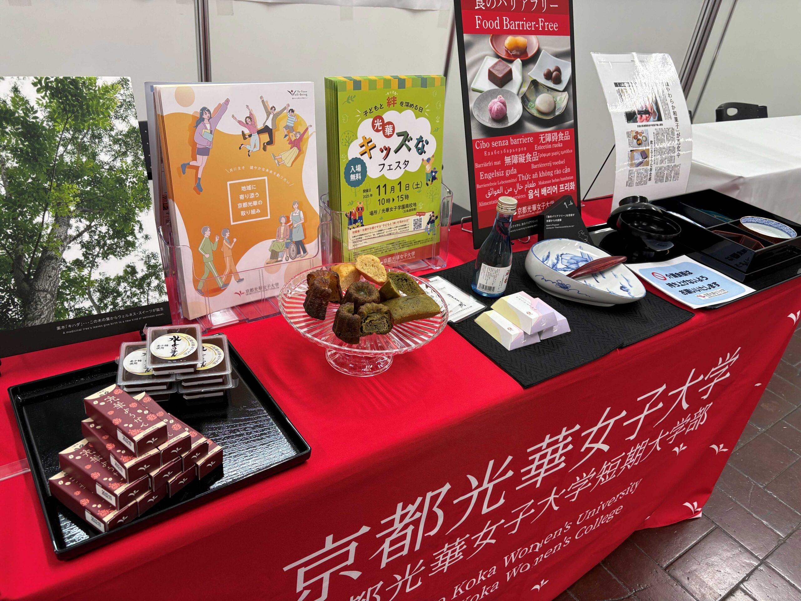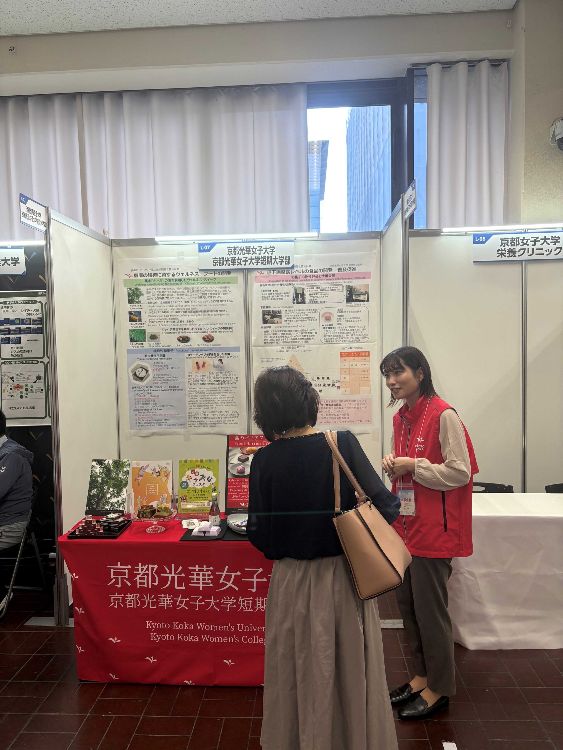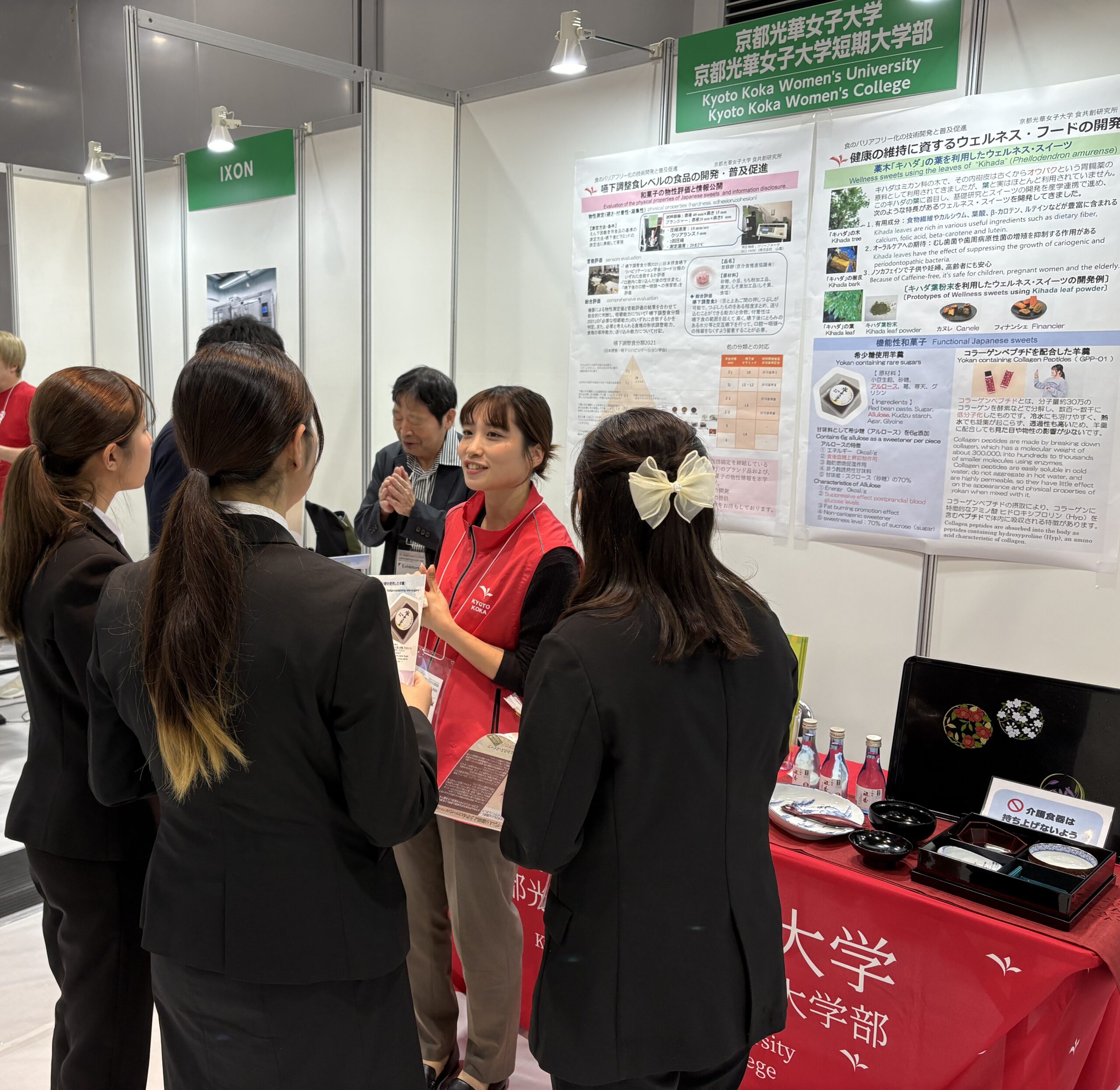 本学のブースでは、研究成果の発信の場として、嚥下調整和菓子の物性に関する研究内容を展示し、機能性和・洋菓子の試食・配布を行いました。