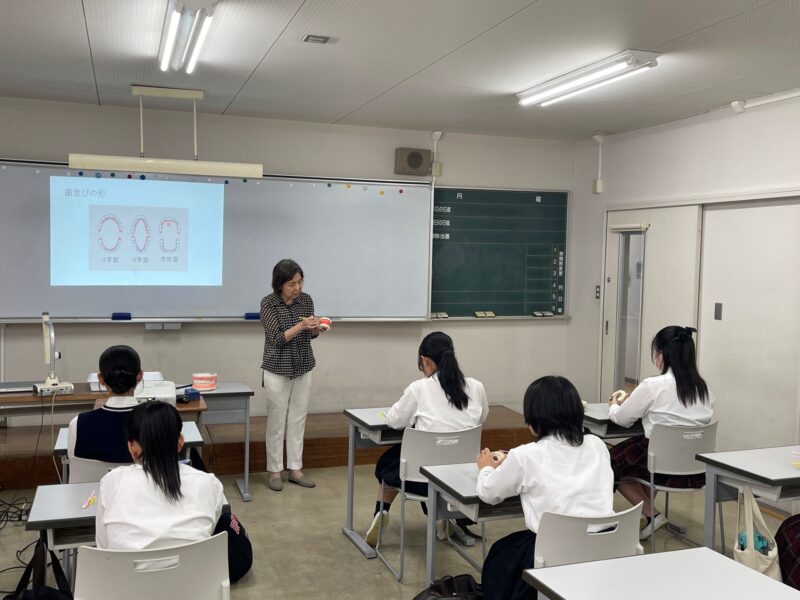 授業では、歯科衛生士の業務内容をわかりやすく紹介するとともに、顎の模型を使って、