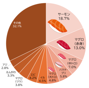 実際にどんなお寿司が食べられているのかは、大手回転寿司チェーンのメニューを調べました。