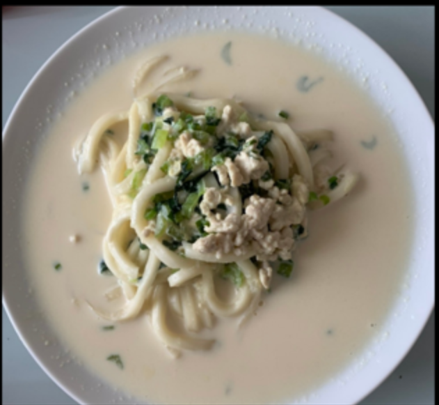 取り分け食の実践として、大人用の豆乳うどんを作る途中に、離乳食用のうどん・肉・小松菜・汁を取り出す形にしました。取り出したうどんと小松菜は1-2cm長さに切り、味付けは豆乳の濃厚さで十分に美味しく食べることができたので調味料は使いませんでした。