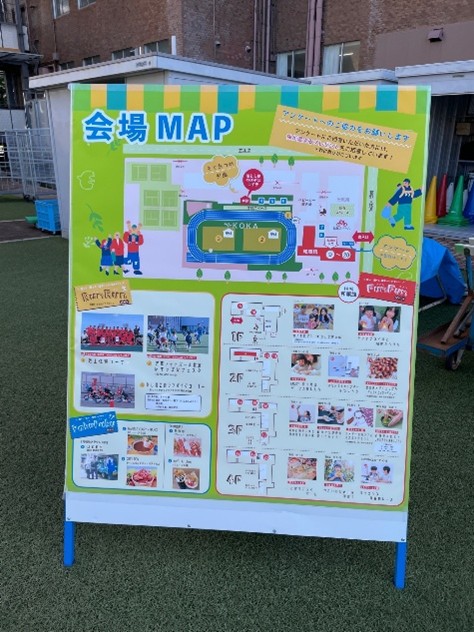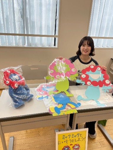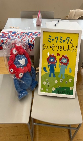 また、「ミャクミャク体操」では、ミャクミャクと一緒に身体を動かしたり、写真をとったりしました。どのコーナーも終始にぎやかで、子どもたちの明るい声と元気な笑顔があふれていました。