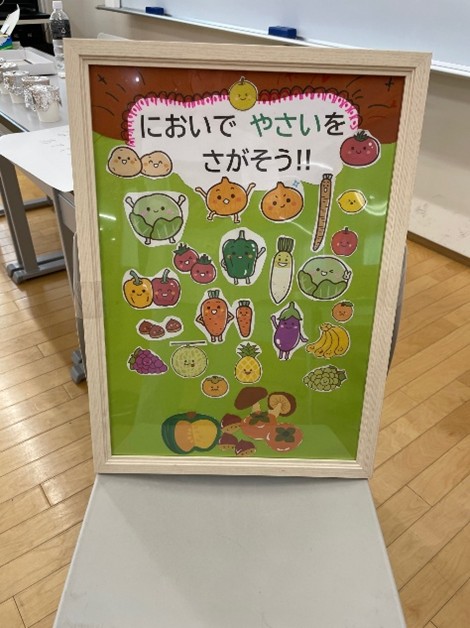 私たち健康栄養学科は和順館4階の教室にて、「やさいのひみつを学ぼう」というブースを担当し、地域のお子さまや保護者の皆さまに楽しんでいただけるよう、五感を使った遊びやクイズを通して野菜について学べる内容を企画しました。