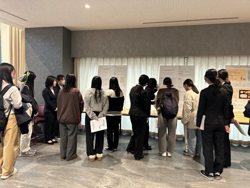 先日、管理栄養士専攻の卒業研究発表会が開催されました。今年はポスター発表形式ということもあり、研究内容を聞きに来た後輩たちも、気軽に質問できる雰囲気となりました。