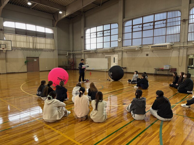 健康栄養学科健康スポーツ栄養専攻と人間健康学群の1回生授業「生涯スポーツ論」で、誰もが楽しみながら健康づくりができるスポーツとして「キンボール」の体験を行いました。キンボールとは直径122cmの大きなボールを使って、3チームがボールを床に落とさないように競い合うスポーツで、この大きなボールが意外に軽いので子どもたちや日常生活で運動をされていない方でも楽しめるスポーツです。