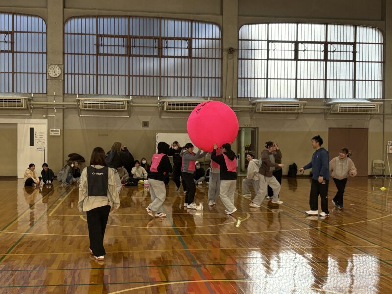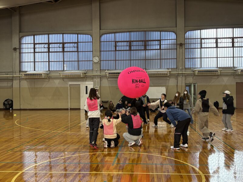 今年も京都府キンボールスポーツ連盟の皆さんにご指導をいただき、この慣れない大きなボールにとまどう学生たちも最後には実際のルールに則ったゲームで学科・専攻をごちゃまぜにしたチーム編成でしたが、好プレーや珍プレーが続出の大きな盛り上がりをみせる体験授業となりました。