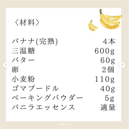 プロジェクト参加の学生メンバーが、同社の商品を使った多様な調理を行っています。ここでは、学生が調理したバナナパウンドケーキをご紹介します。とても美味しそうです。材料、作り方も紹介していますので、ぜひ調理してみてください。