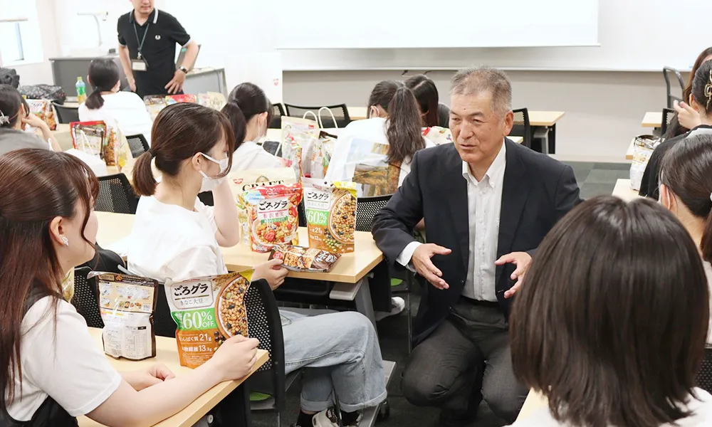 管理栄養士専攻3年生を対象に、日清シスコ株式会社様より特別講師をお招きし、ご講義いただきました。講義では、商品設計、品質・安全性評価など、食品開発プロセス全般に関する専門的な知識や、開発現場で重視される実際的な視点について解説いただきました。