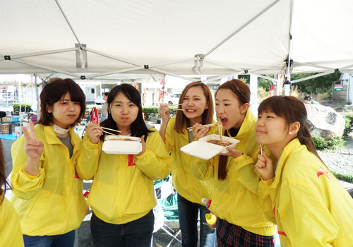 そして本番。快晴で最高のお祭り日和でした。ひとりひとり自分の役割をガンバって、掛け声、宣伝もみんな一生懸命しました。高知県嶺北との交流が多いライフデザイン学科は、買いに来てくださったお客様の中に、「地域連携実践演習Ⅰ」の授業でホームステイした学生のホストファミリーの方が来てくださったり、嶺北地域でのサマースクールの下見の時に、ピザづくりを体験させていただいた講師の方も来ていただきました。役場の方や協議会の会長さんもお客さんを呼んできてくださったりなど、嶺北の方とのつながりが深くなっていることを実感して感動しました。