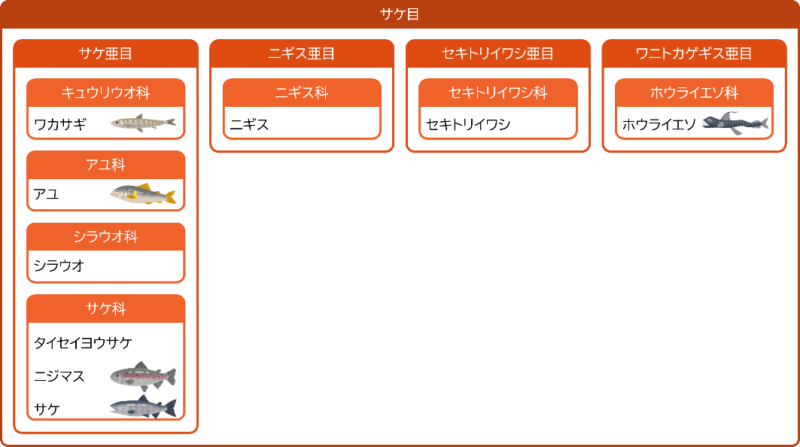 分類の階層は,上から界門綱目科属種が基本です。例えば,「サケ(シロザケ)」は動物界,脊索動物門,硬骨魚綱,サケ目,サケ科,サケ属の魚です。