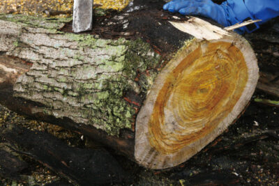 切り倒されたハゼノキ。ハゼの黄色い芯を使うのか、樹皮を使うのか、確実にはわかっていません。