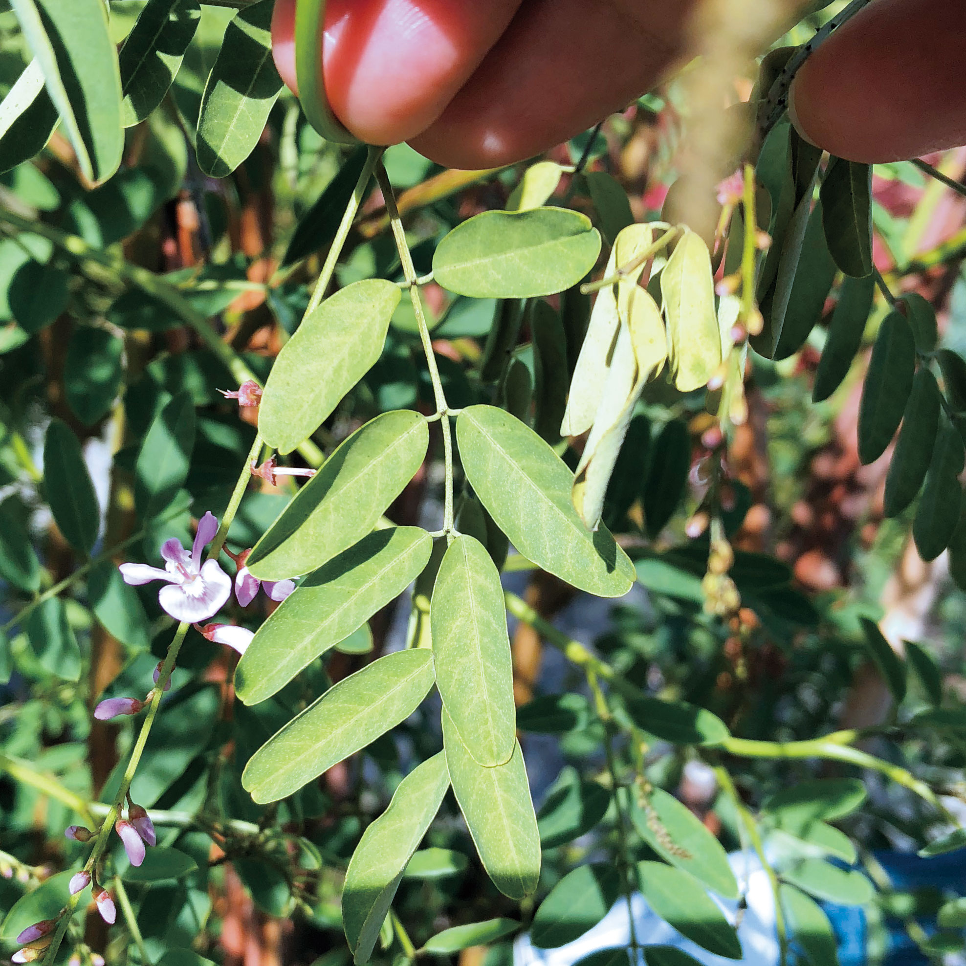 マメ科のナンバンコマツナギ。中南米でマヤの時代から藍染めに使われていた植物です。