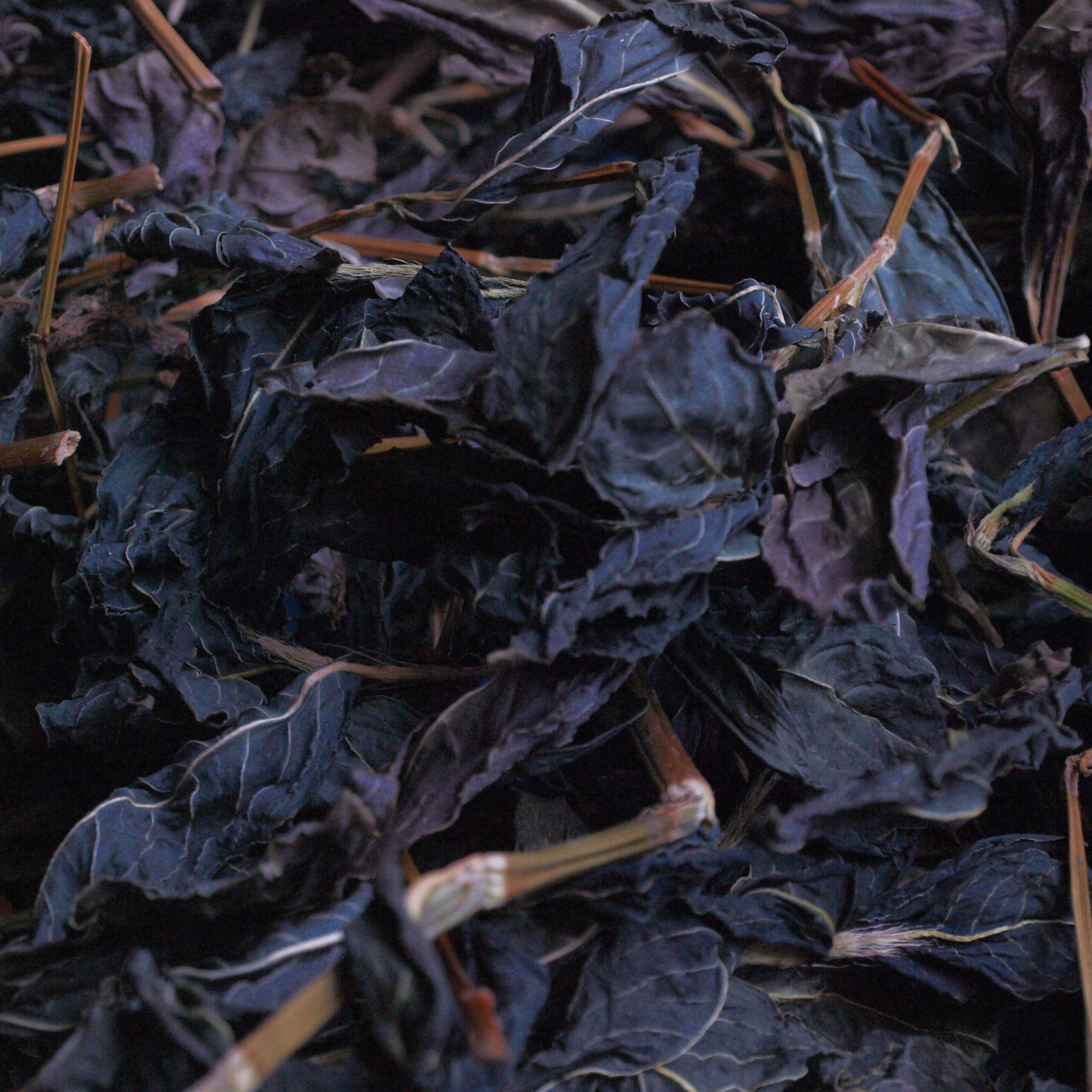 タデ科のアイを乾燥させたもの。アイに限らず、藍染めができる植物は乾燥すると葉がこのような紫がかった暗い色になります。