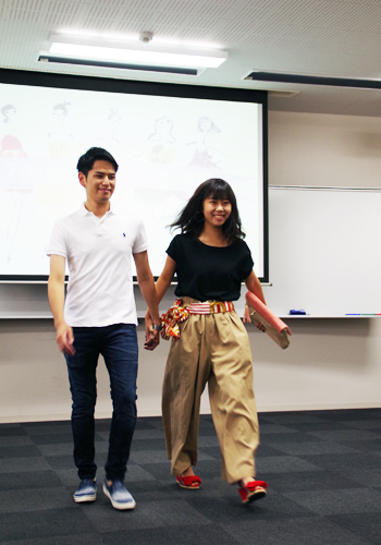 当日は、昨年度の授業で1番人気のあったファッションショーを取り入れました。「あるシチュエーションにふさわしいファッションを考えてもらう」というのがテーマです。今回は、①彼氏とホテルでランチバイキング②その後、彼氏の父親の個展を見に行き挨拶③最後に彼氏と花火、としました。本来なら参加者の皆さんに事前にテーマをお知らせし、当日各自で考えたファッションで参加してもらうのですが、今回はオープンキャンパススタッフの学生2人に考えてきてもらい、実際にファッションショーを行いました。彼氏役は入試広報部の職員さんにお願いしました。
