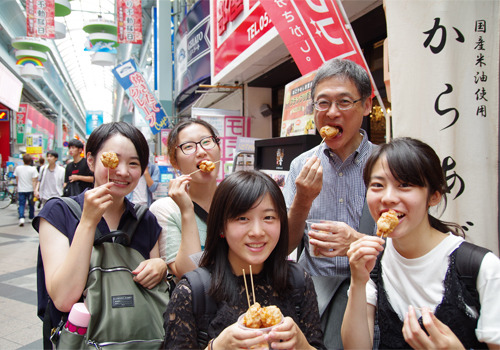 大須商店街では、最初に揚げまん棒を食べました。大須の食べ歩き名物で、丸いドーナツ生地の中におまんじゅうが丸ごと入っています。揚げたてで、とてもおいしかったです。他にも、台湾の包子(パオズ)という小籠包(ショウロンポウ)のようなものや、見た目がかわいくておいしいソフトクリームを食べました。そして全員で串カツと団子をシェアしました。名古屋で有名なみそカツも、手軽に食べることができました。大須でしか食べられない名物をたくさん堪能しました!