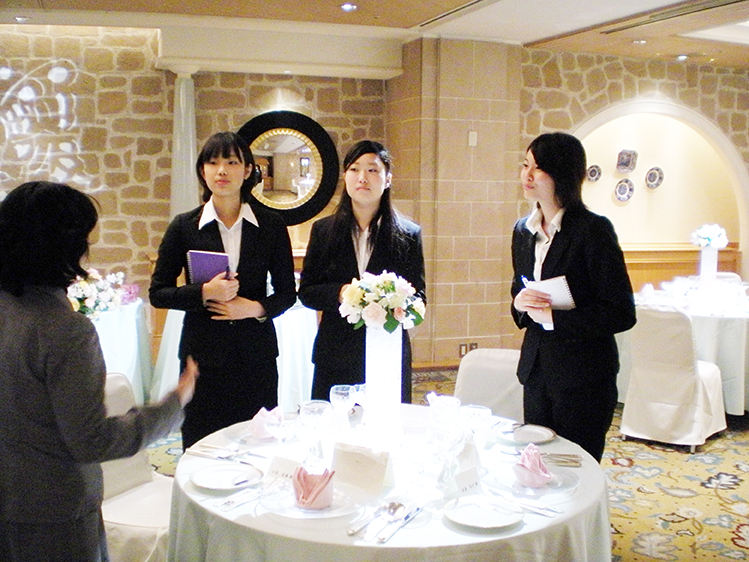 ロビーでの模擬挙式は初めて見たので、とにかくすごいと思った。バンケットのコーディネートも、上品で豪華で本当に素敵だった。このコーディネートが出来るセンスを身に付けたいと感じた。