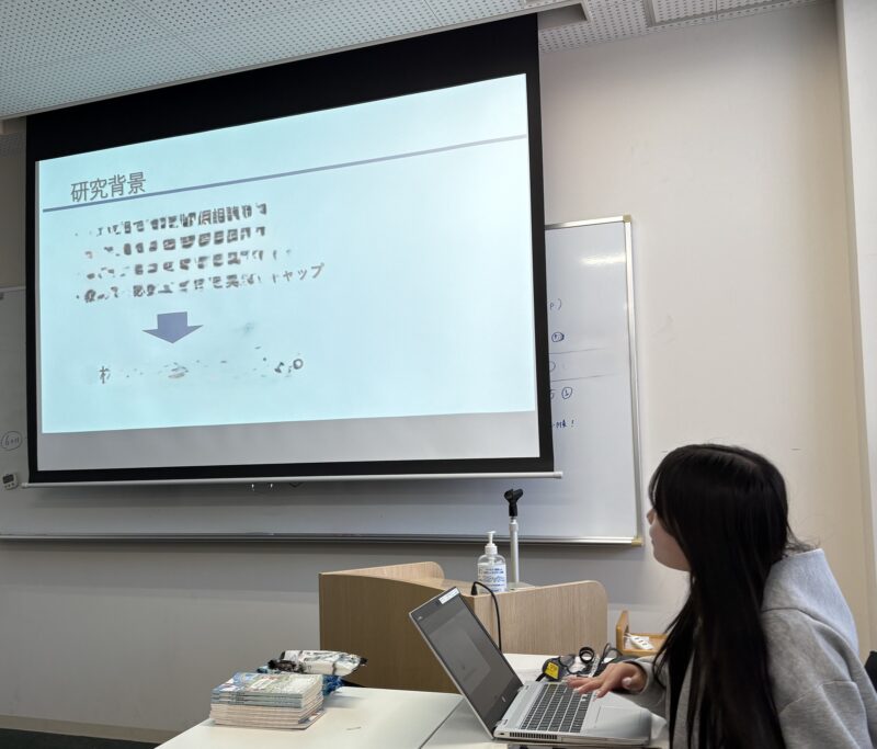 興味のあるテーマについて先行研究を調べ、考察を重ねながら10ページほどの論文にまとめました。そして昨日は、その成果をスライドにしてメンバーの前で発表しました。