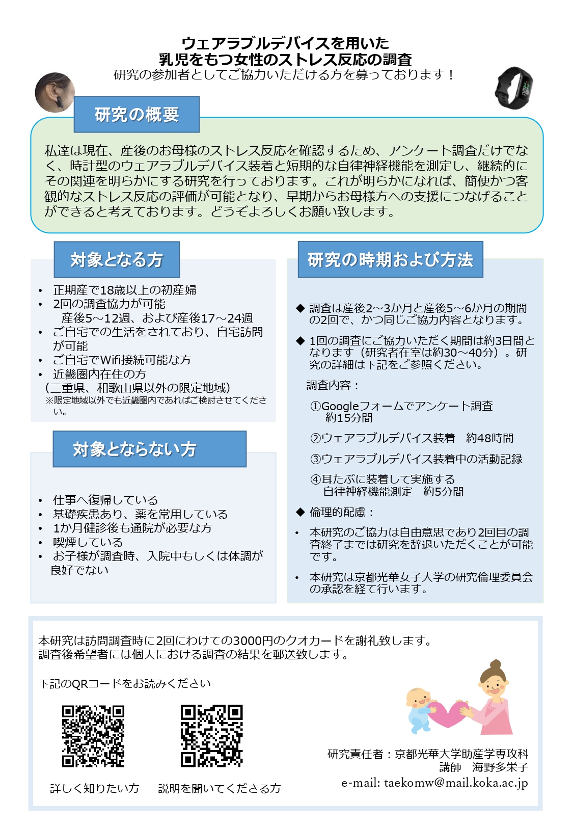この研究により、自律神経機能測定を通しての簡便かつ客観的なストレス反応の評価が可能となり、早期からお母様方への支援につなげることができると考えております。