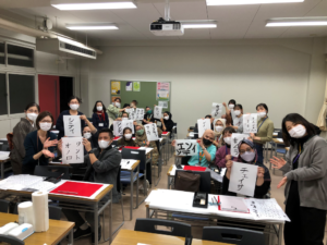 11月15日に行った「大学生との書道体験」では、本学の学生・教職員が13名参加し、筆の運び方やカタカナでの名前の書き方を教え、楽しく交流しました。 インドネシアの皆さん、日本語を書くのは初めてでしたが、とても上手ですね!