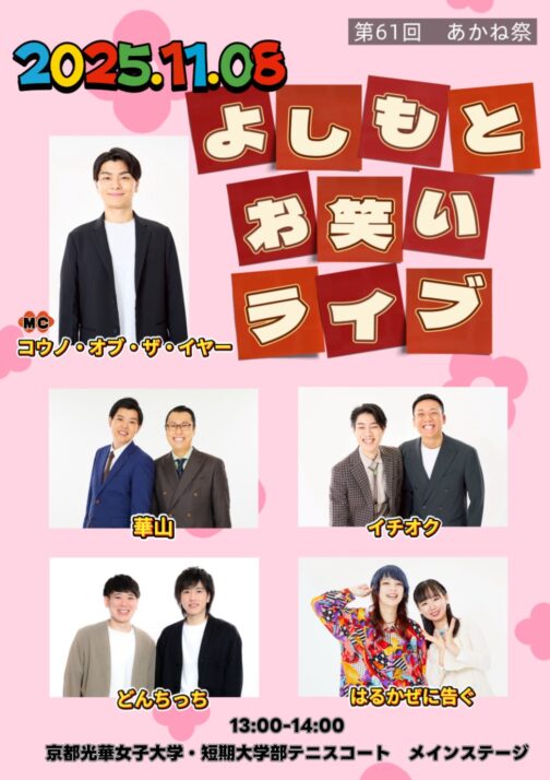 内容 | ・模擬店 ・サークル等のステージ発表 ・よしもとお笑いライブ ・声優 柿原徹也さんによるトークライブ ・キャラクターショー ・その他、ビンゴ大会等 |