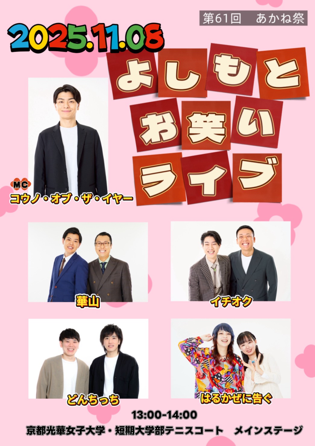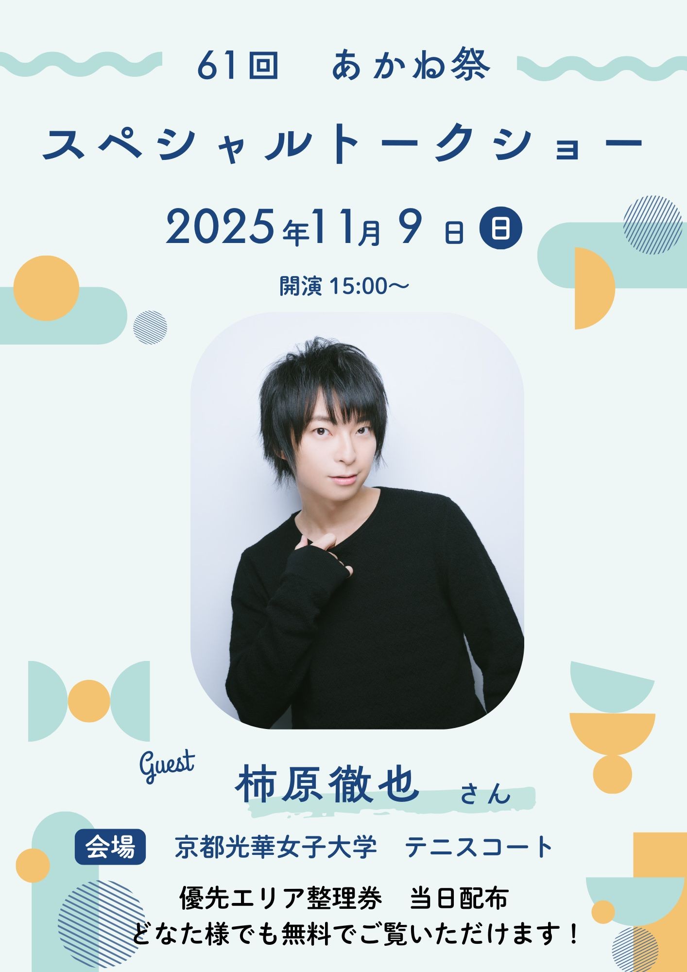 入場 | 予約不要・入場料無料 ※声優 柿原徹也さんトークショーの整理券は11:30~テニスコート・メインステージ後方で配布します。 ※整理券をお持ちの方はステージ前方で観覧いただくことが可能となりますが、整理券がなくてもステージは観覧できます。 ※配布時間前に正門前に並ばないでください。 ※トークショーおよびキャラクターショーの撮影・録音は一切禁止です。携帯電話などのカメラをステージ側や、運営スタッフ、他のお客様がいる方向に向けないようご注意ください。 ※整理券はランダム配布となっています。詳しくはinstagramに掲載している注意事項をご一読ください。 あかね祭instagram https://www.instagram.com/koka_akanesai_2025/ |