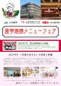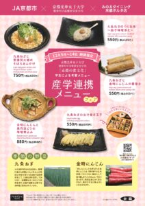 この度、健康栄養学科(管理栄養士専攻・健康スポーツ栄養専攻)の学生5名が考案したメニューが、産学連携メニューフェアとして、JA全農京都が運営する「みのるダイニング京都ポルタ店」にて採用され、2025年12月5月~14日の期間で販売されることとなりました。 京野菜を使ったバラエティー豊かな料理となりますので、ご興味のある方は、是非足をお運びください。