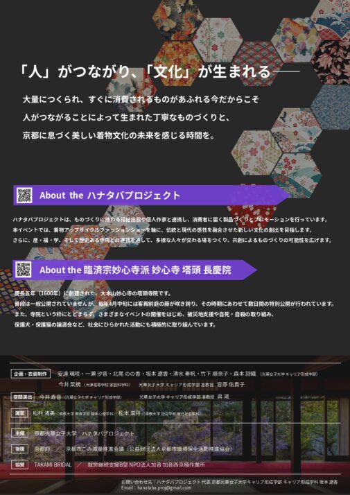ものづくりに携わる福祉施設や個人作家と連携し、着物アップサイクルを通じて「人がつながることで生まれる丁寧なものづくり」と「京都の着物文化の未来」を発信することを目的としています。