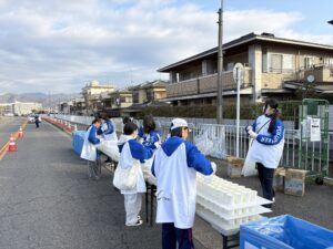 昨年に引き続き、本学はスタート地点から約5キロ地点の嵯峨・嵐山ブロックにて第1給水所を担当しました。今回のボランティアには健康栄養学科(管理栄養士専攻・健康スポーツ栄養専攻)、こども教育学科、作業療法専攻、社会福祉専攻、キャリア形成学科の1・2年生と、さまざまな学科・学年の学生が参加しました。ほとんどの学生が京都マラソンのボランティアは初めての経験でしたが、スムーズに楽しみながら給水所の設営を行いました。