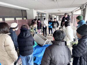 2月8日、季節外れの寒い吹雪の日となりましたが、写真にあるチラシで近隣の方にお呼びかけを行いましたところ、本学教職員や学生に加え地域の方々や留学生にも多数参加いただき、総勢18名で実施しました!