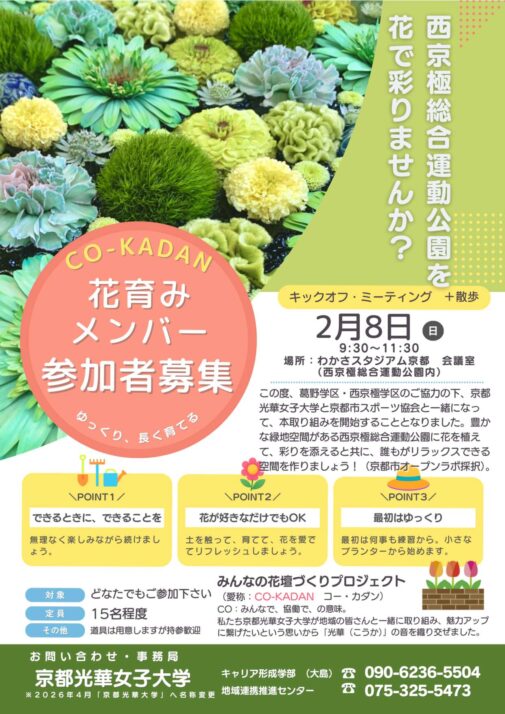 西京極総合運動公園を、スポーツを楽しむ場所だけでなく「花と緑を通じてみんなが笑顔になれる場所」へ。そんな活動が京都光華女子大学でスタートしました。この取組は、西京極総合運動公園の指定管理者である公益財団法人京都市スポーツ協会さんと共に取り組み、葛野学区、西京極学区の協力を得ながら進めて参ります。