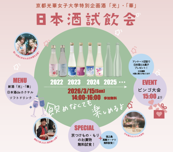 地元京都・伏見の酒蔵「招徳酒造株式会社」との産官学連携の取組として、学生が企画・開発に携わる光華ブランドのオリジナル日本酒「光 HIKARI」「華 HANA」の試飲会を、2026年3月15日(日)に開催します。