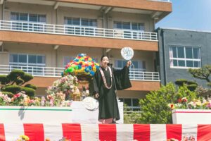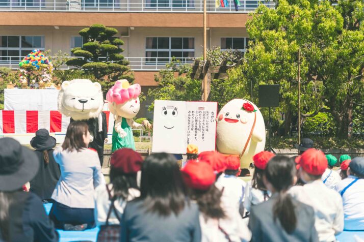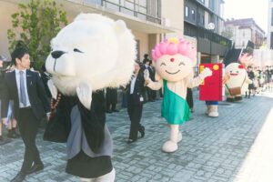パレードの最後には、東本願寺の公式キャラクターである鸞恩(らんおん)くん、蓮(れん)ちゃん、あかほんくんに加え、京都光華大学学生会のマスコットキャラクター「はなたん」も登場し、園児たちの笑顔があふれるひとときとなりました。
