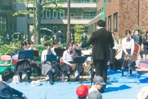 当日は、小学生マーチングバンドや中高吹奏楽部の演奏、中高バトントワリング部などによる華やかなパレードを実施しました。小学生が引く白象の行進も行われ、会場は花まつりらしい晴れやかな雰囲気に包まれました。