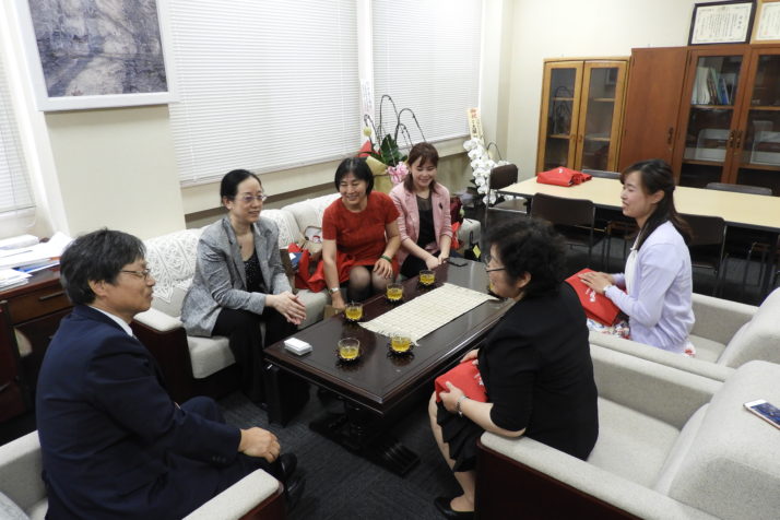 当日は本学専務理事、学長とのご挨拶のあとに、副学長3名、健康科学部の教員を交え懇談会が行われ、最後には本学キャンパス内を見学に回られました。研究所の皆様は特に、日本の看護教育や栄養教育のシステム及び看護師のコミットメントを高める教育等に関することに興味をお持ちで、懇談会では、日中看護教育システム等について交流し、看護学科の実習施設なども興味深く見学していただきました。