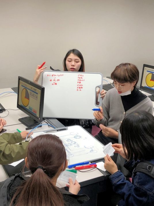 講座のはじめには「海外に行ってみよう」「海外で身につけたいもの」といったテーマで アクティブラーニング形式の講義を行い、海外・国際に対する学びを深めていただきました。また、講座では知識をつけるだけでなく、国際人として活躍するために必要なコミュニケーションやチームワークを身につけるため、グループワークも実施しました。講座には滋賀短期大学附属高校出身の本学ライフデザイン学科生がファシリテーターやSAとして参加し、高校生たちと共にグループワークを盛り上げ、活発に意見を出し合っていました。