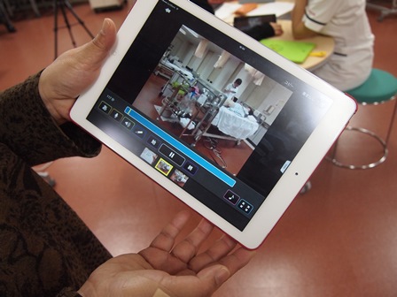 本学では、その機能を学生の看護技術の向上のために活用しています。学生自身が互いにベッドメーキングなどを行っている様子を、タブレット端末を使用して撮影し、その動画を基にアプリ上で学生同士が技術を評価し合います。教員が全員の動画を確認することもできる他、アプリ内でプレゼンテーション資料を作成することもでき、これまでの学習内容をまとめることができます。