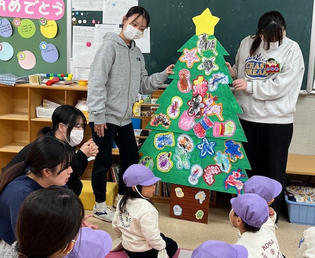 満3歳になる子どもたちには、カードに子どもたちが色塗りして、最後はそれを大きなツリーに貼ってクリスマスツリーの完成です!!🎄