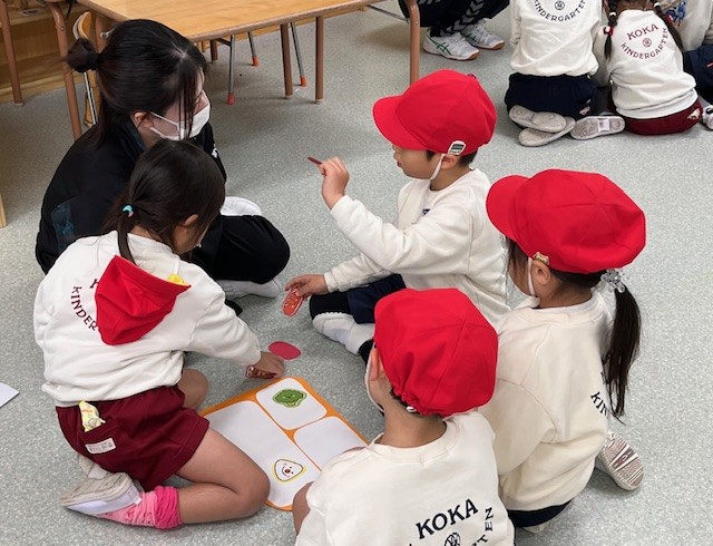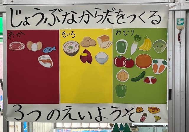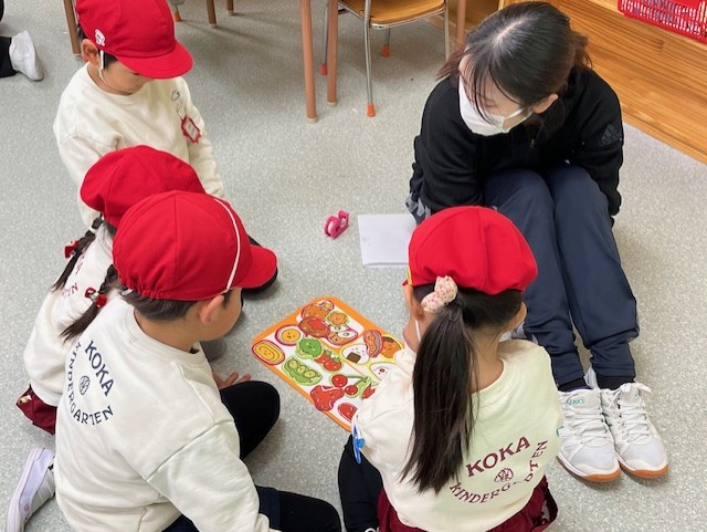 4歳児の子どもたちには、食事のバランスを考えようのテーマで、からだに大切な「えいよう」というお話で、いろいろな食材についてどのような働きの食材かを考えました。