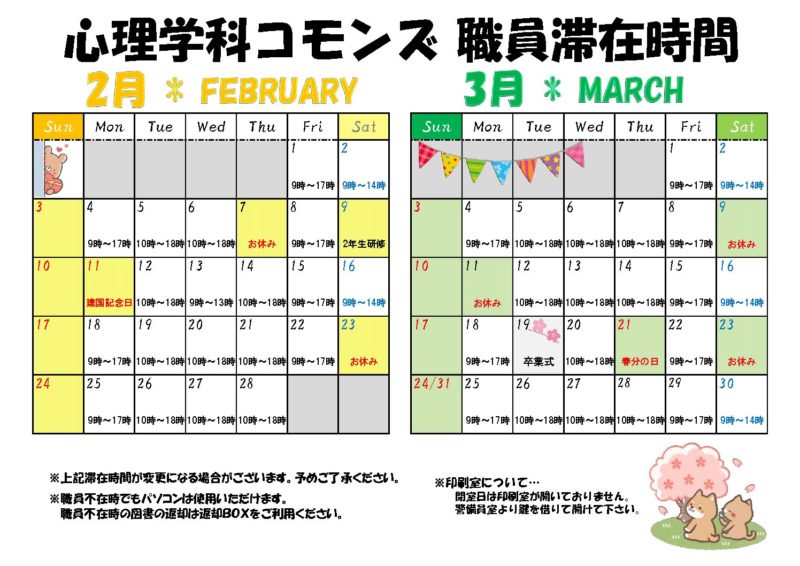 さて、大学の授業はお休み期間に入りますが、心理学科コモンズカウンター、また、コモンズ併設の図書室は2月・3月も開室しておりますので是非ご利用ください。